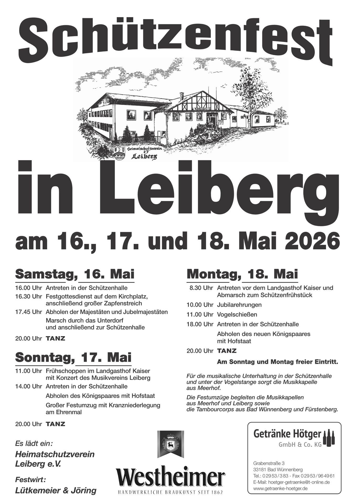 Es ist mir eine große Freude, Sie und Euch alle wieder auf unserem diesjährigen Schützenfest vom 16.05.2026 bis zum 18.05.2026 begrüßen zu dürfen. Als Oberst ist es mir ein großes Anliegen, die Bedeutung dieses Festes für die Gemeinschaft in unserem Dorf Leiberg hervorzuheben. Es wäre sehr schön, wenn auch Sie wie all die Jahre zuvor Ihre Verbundenheit zum Leiberger Schützenfest zum Ausdruck bringen und unser Dorf durch Fahnen, Wimpel in ein „buntes Dorf“ verwandeln würden.